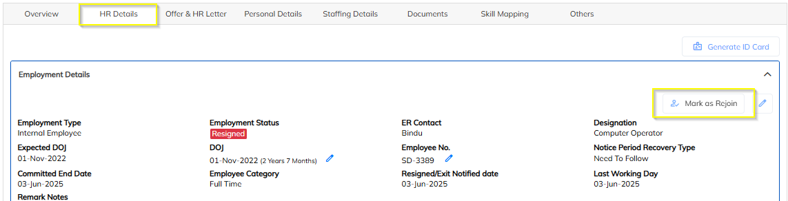 Step 5: Click on the mark as rejoin and mark the resigned employee as rejoin in the Yet to Join status.
