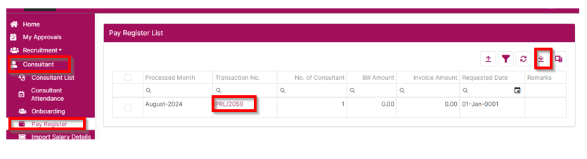 - In the client portal login under Consultant -->> Pay register option, shared pay register will be available. User can able view the payroll details and can export in the report format. Refer the screenshot.