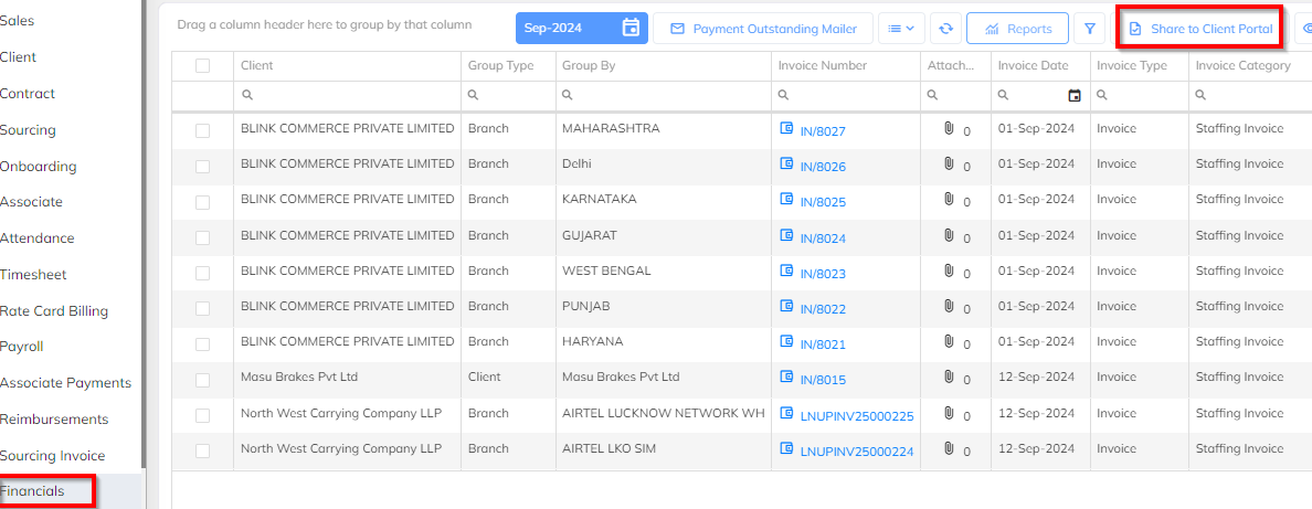 - Once the Invoice has been generated, In processed status, we can share the selected invoice to client. Share functionality is available in processed status. Select the specific invoice and share to client login using the share option. Refer screenshot.