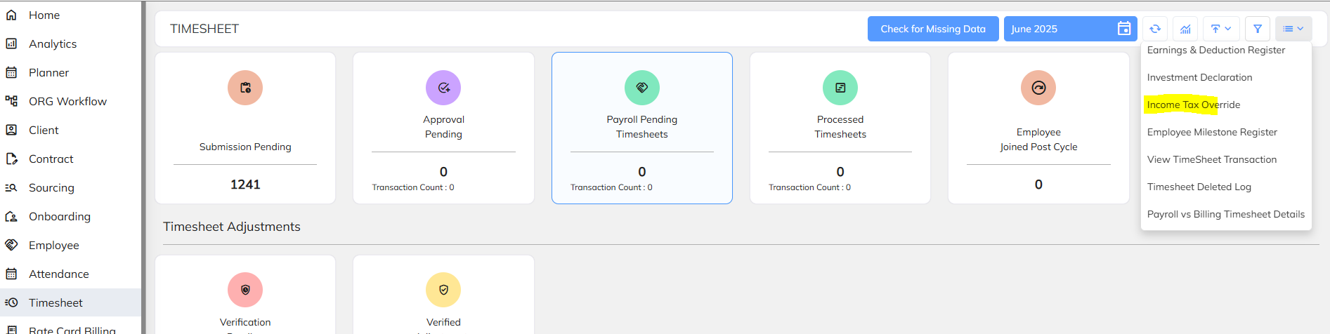 Navigate to Time sheet Dashboard >> Go to Extension Dropdown button >> Select "Income Tax override" button