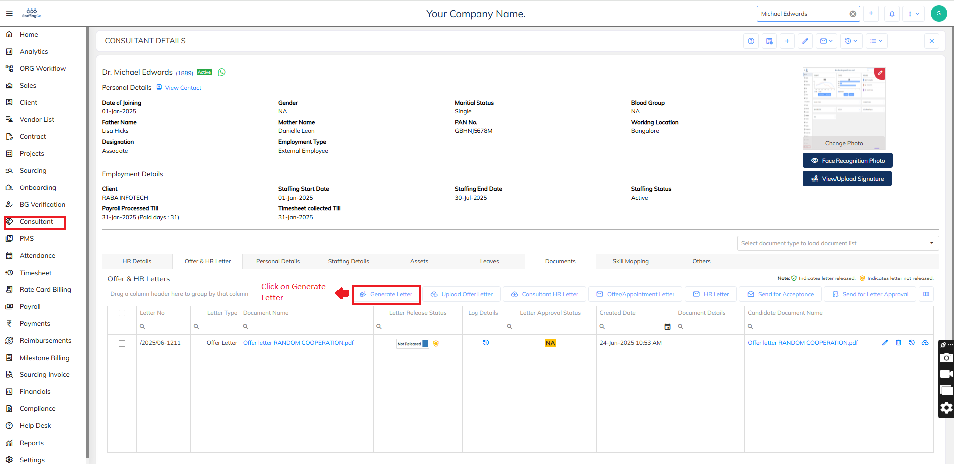 - Go to Consultant for whom you want to generate the letter