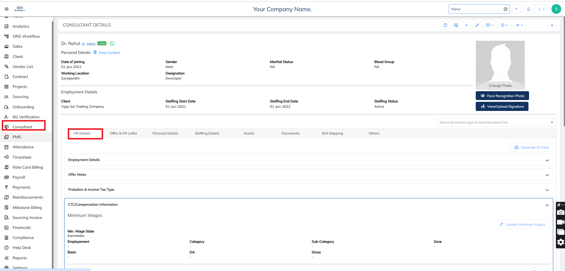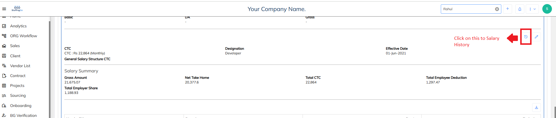 - Under the selected Consultant section --> Navigate to the HR Details --> CTC/Compensation Information--> Click on the Salary history icon which available.