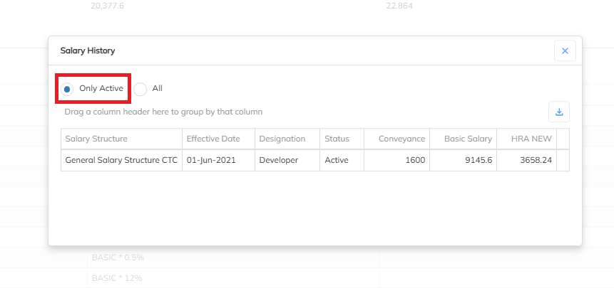 - Active: This will the show the currently active salary history mapped to the Employee