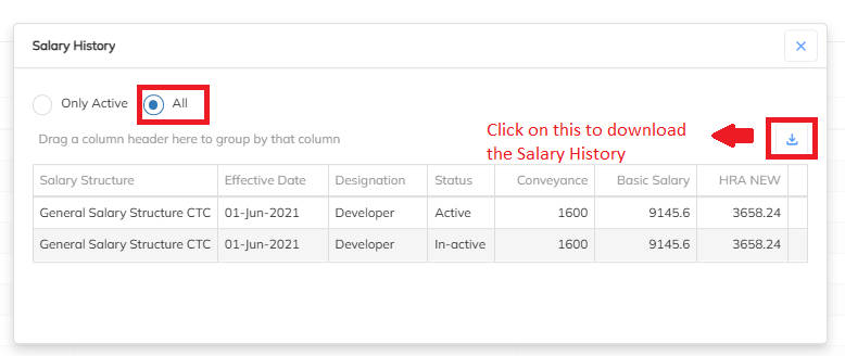 - Export the details using the download option which is available in the Salary history.