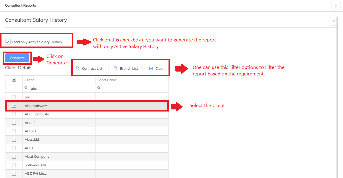- Once all the filtered are applied and the relevant Clients are selected --> Click on Generate to generate the Salary History report.