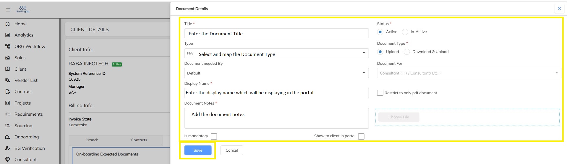 - Here you can add new Document details and also enable "Yes" or "No" if you want to consider Only the following documents to be considered for Consultant Onboarding