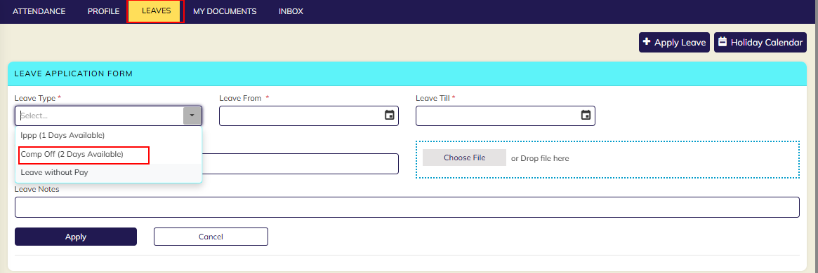 - Click on the drop down “Worked Date for Comp off” and select the date on which you have worked which also is eligible for comp off