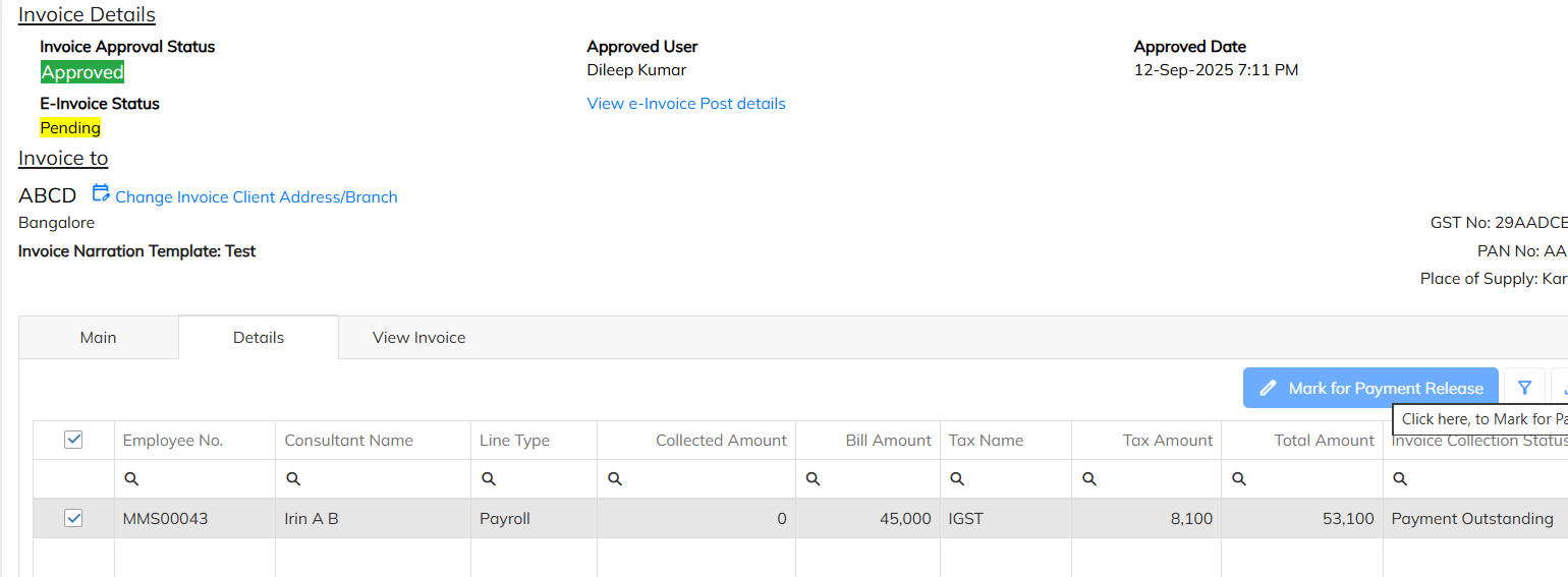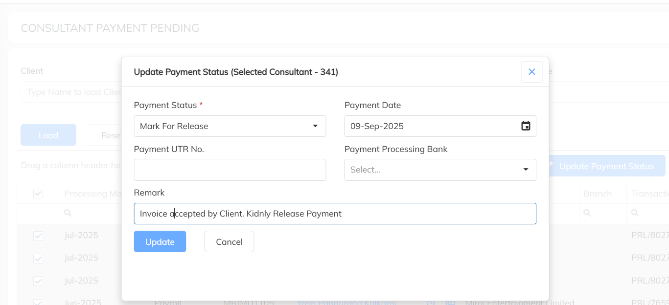 - Select Payment Status as "Mark for Release" and click on Update button.
