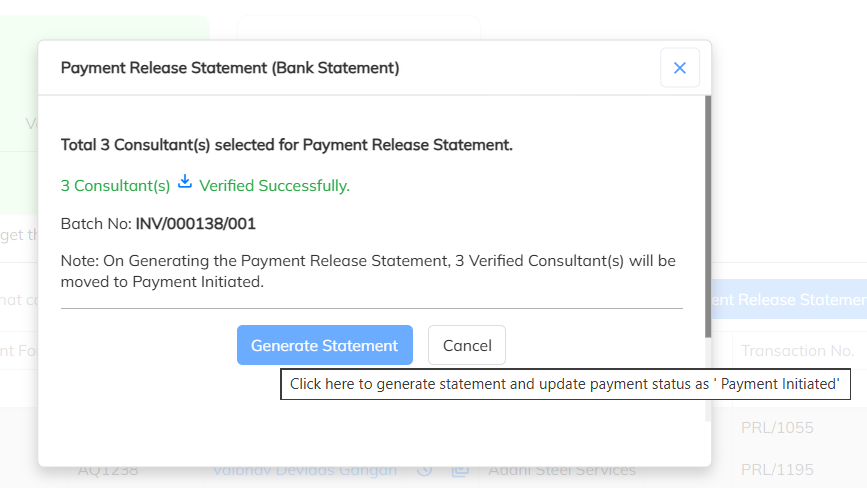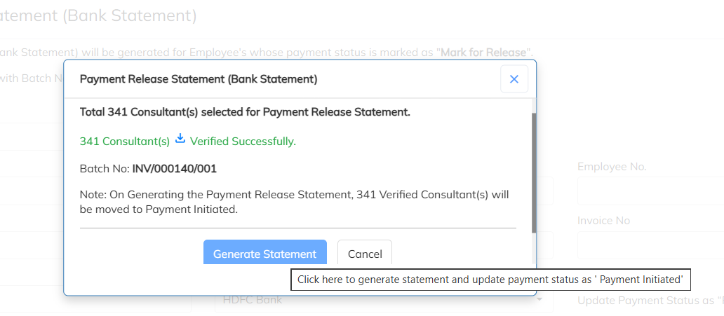 Post the confirmation from Operation Team, Finance Team will select appropriate employees and Generate Bank Statement to initiate Payment.