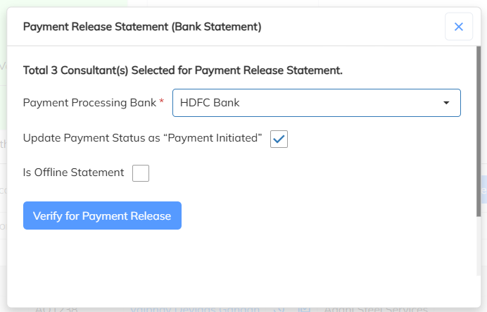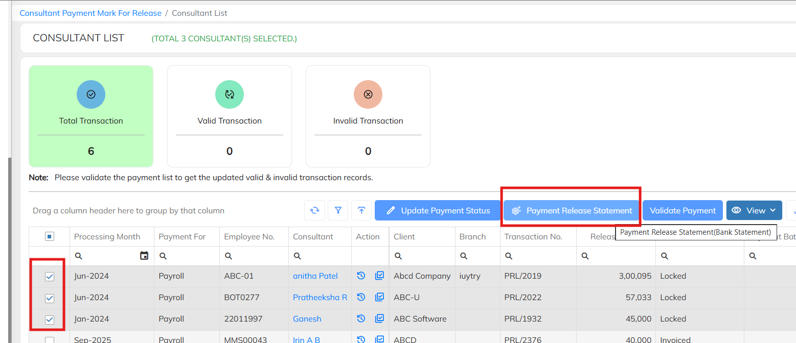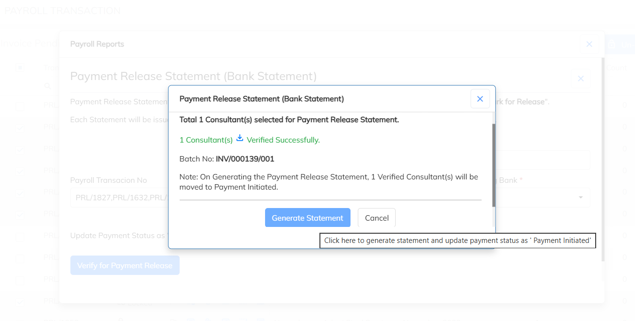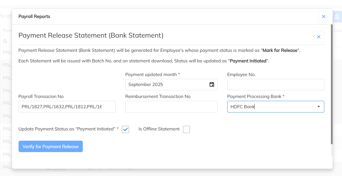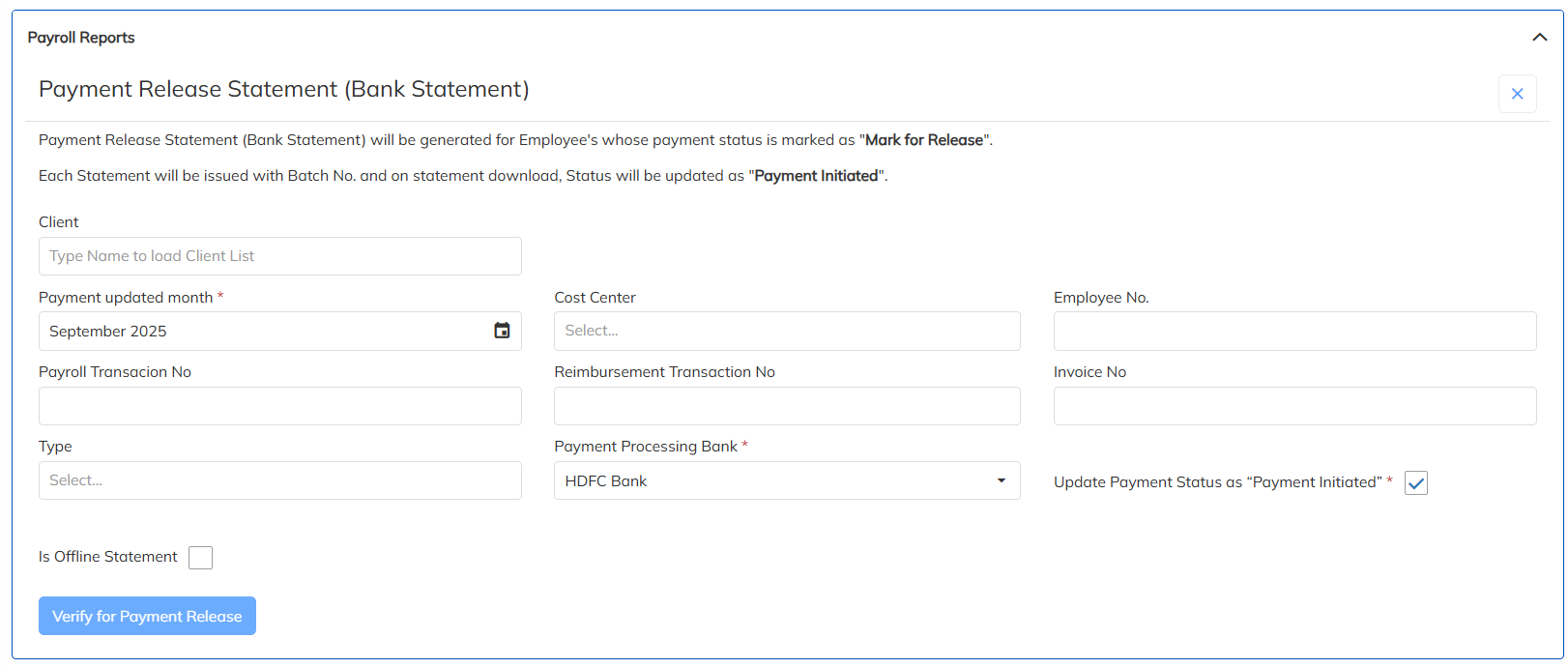 - Select Employees and Click on "Payment Release Statement" button to generate Bank Statement