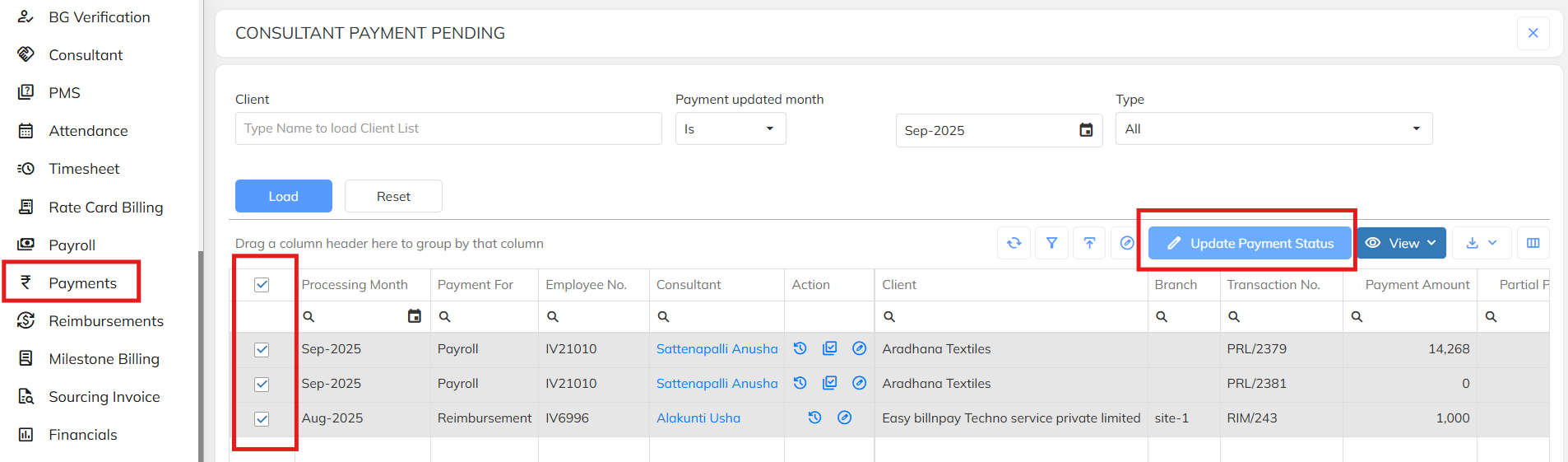Post Bank Transfer, User will have an Excel Import / Payment Status update option to update Payment Status as "PAID" with payment UTR Details received from the Bank.