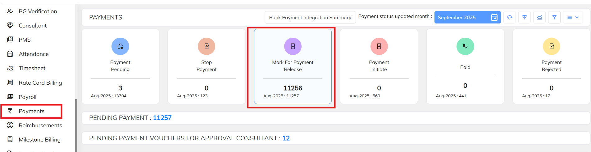 Operation manager/Account manager, Post confirmation from Client on Pay Register in case of FUNDING Client and Post Invoice acceptance of Client in case of NON-FUNDING Client, Employee's Payment status will be marked as "Mark for Release". i.e., Employees were ready to Initiate payment.