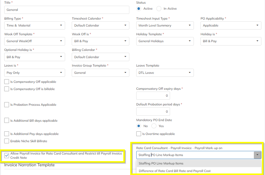 Payroll Invoice allowed for Rate Card Employees and restricted until Payroll Invoice Credit Note; this setting is now managed under Billing Options (moved from Portal Settings).