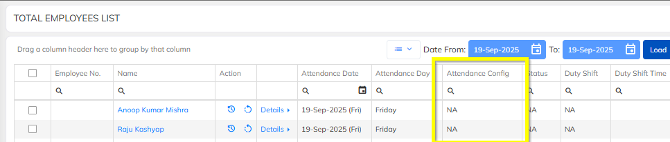 Employee Attendance Dashboard now displays Attendance Config Type.