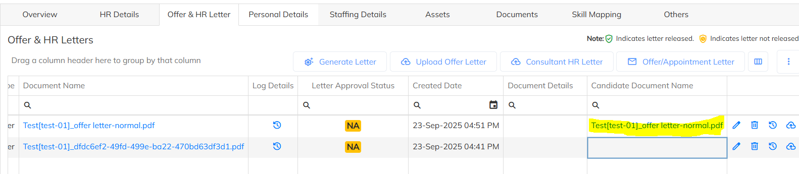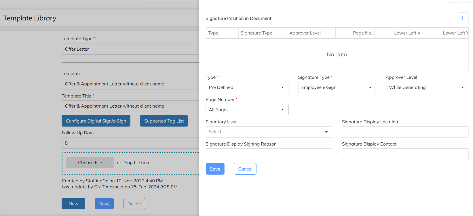 In the StaffingGo application configured all Offer / Appointment / HR Letter need to configure with Employee e-sign configuration using digital sign configuration. We can able to set up the employee sign all pages of the acknowledge letter / in the last page based on the configuration.