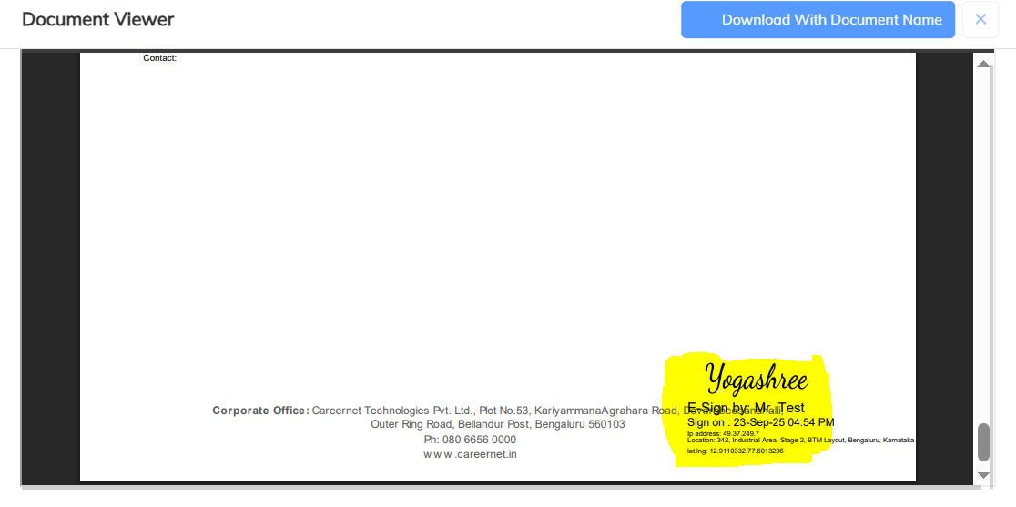 Once employee has signed and accepted . Accepted acknowledge copy auto reflect in the application. Employee acknowledge copy will receive with sign & IP address & location & Date.