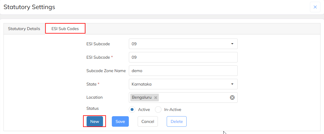 Navigate to Company setup >>Statutory Settings >>Choose ESI Sub-Code Master. Click on Add New Sub-Code.