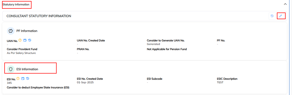 Navigate to Employee Module >>Search and select the employee record >> Navigate to HR details >> Statutory information.
