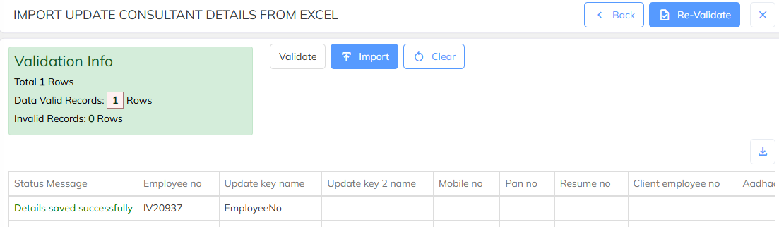 - Select the Update consultant details import option and click on the same option and download attached excel format to to prepare the date to import in the bulk.