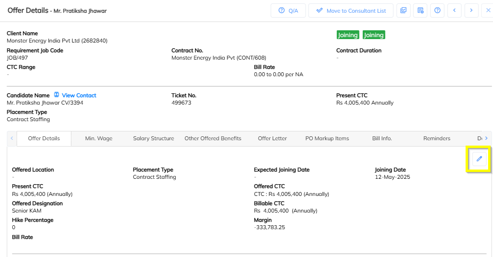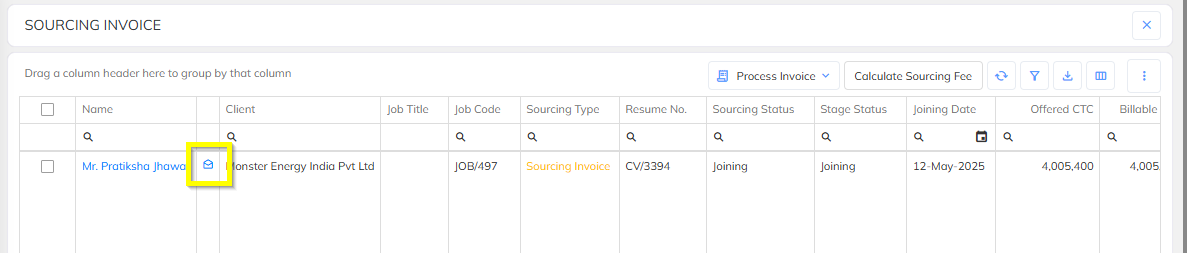 The application provides an option to edit the CTC amount for sourcing invoice employees. Follow the steps below to update the CTC details: