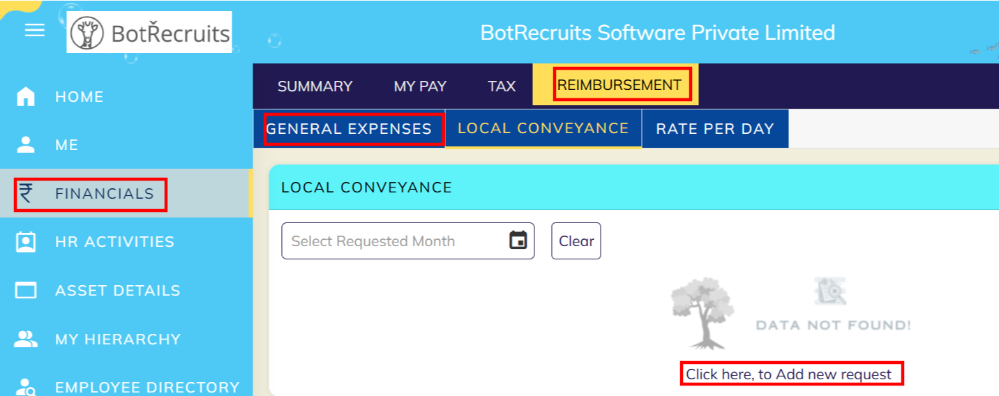 ESS Portal → Financials option >>Reimbursement → General Expenses / Local Conveyance / Rate Per Day