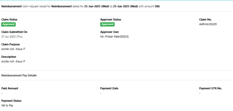Also for the claimed reimbursement paid status which process by the HR team can also view by the employee with UTR through View option.