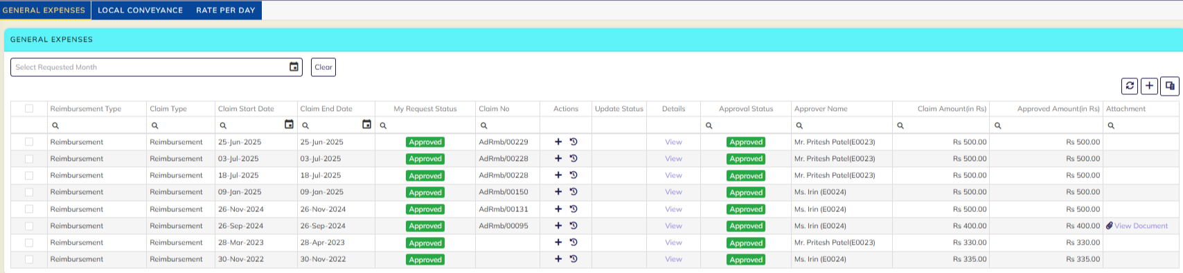 This module allows employees to submit claims such as General Expenses, Local Conveyance, or Rate per Day with proof attachments for approval.