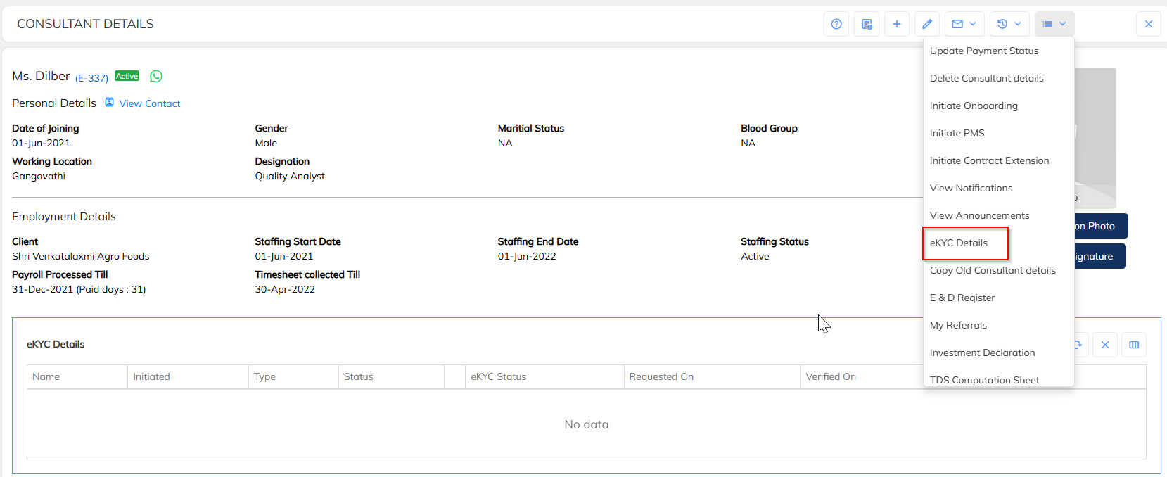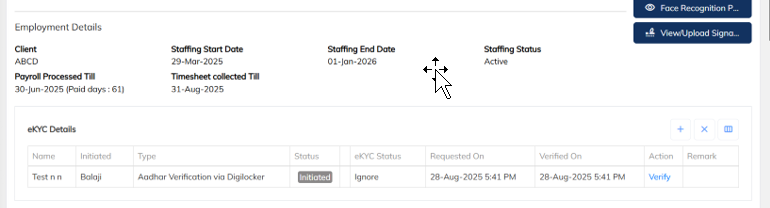 - If verification is successful, the Aadhaar eKYC details will appear automatically under the employee’s profile in the application.