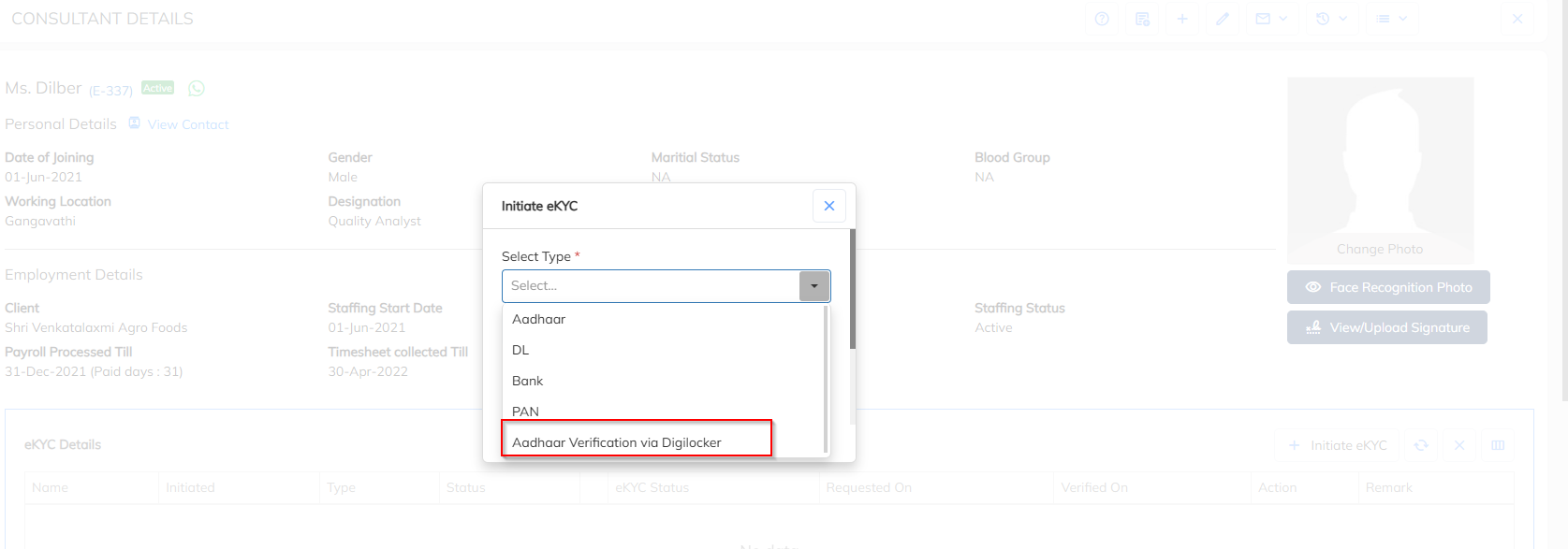 The Aadhaar eKYC process through DigiLocker allows you to verify an employee’s Aadhaar card directly within the application.