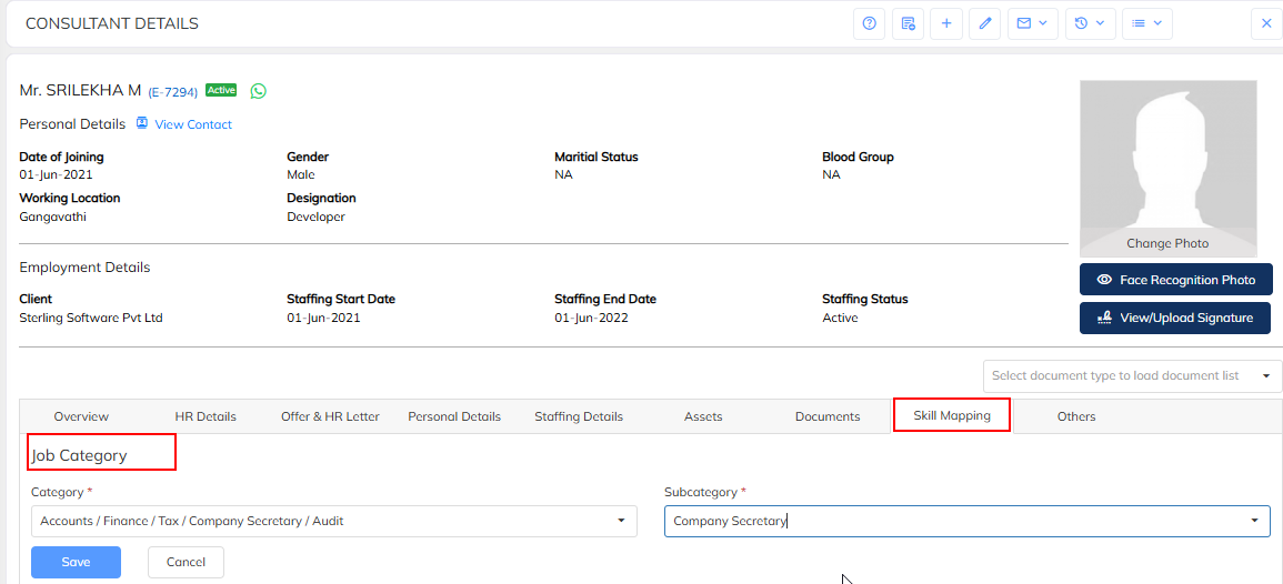 - Under the Skill Mapping section, Select the Job Category from the category dropdown list job category will load & in Sub category dependent sub category data list will load. Select and save the details.