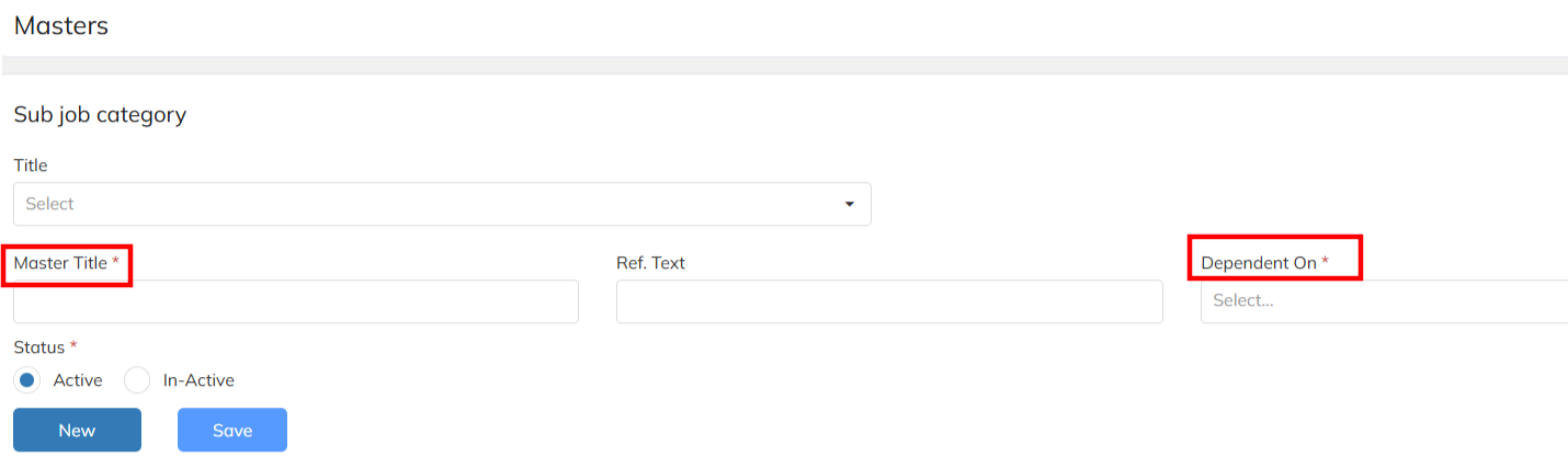 - Navigate to Sub- category option-->> Create the Master title of the sub category and map the dependent on is mandatory. In the dependents drop-down will reflect the created Job category details and save.