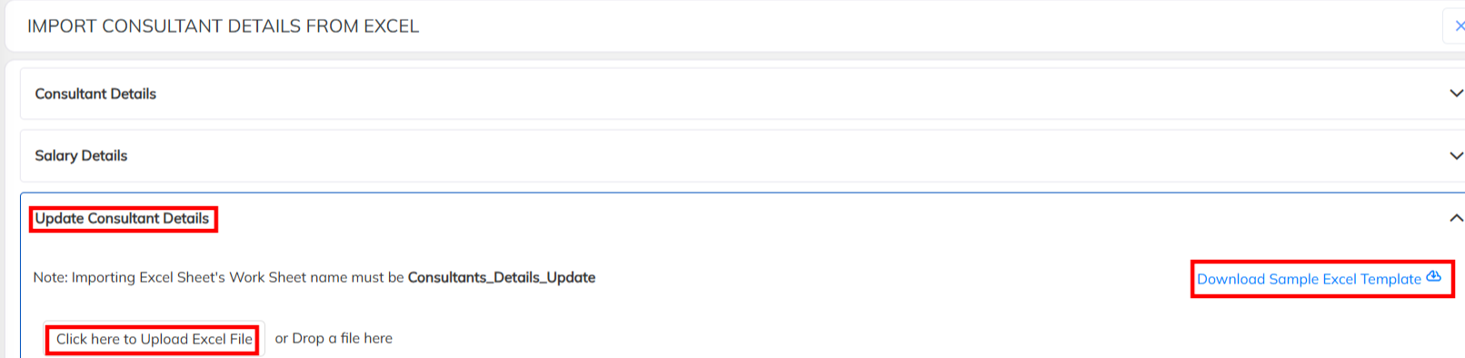- Choose the update consultant import option & download the same excel import and prepare the input details in the same sheet.