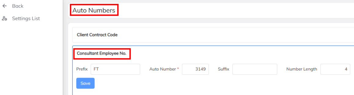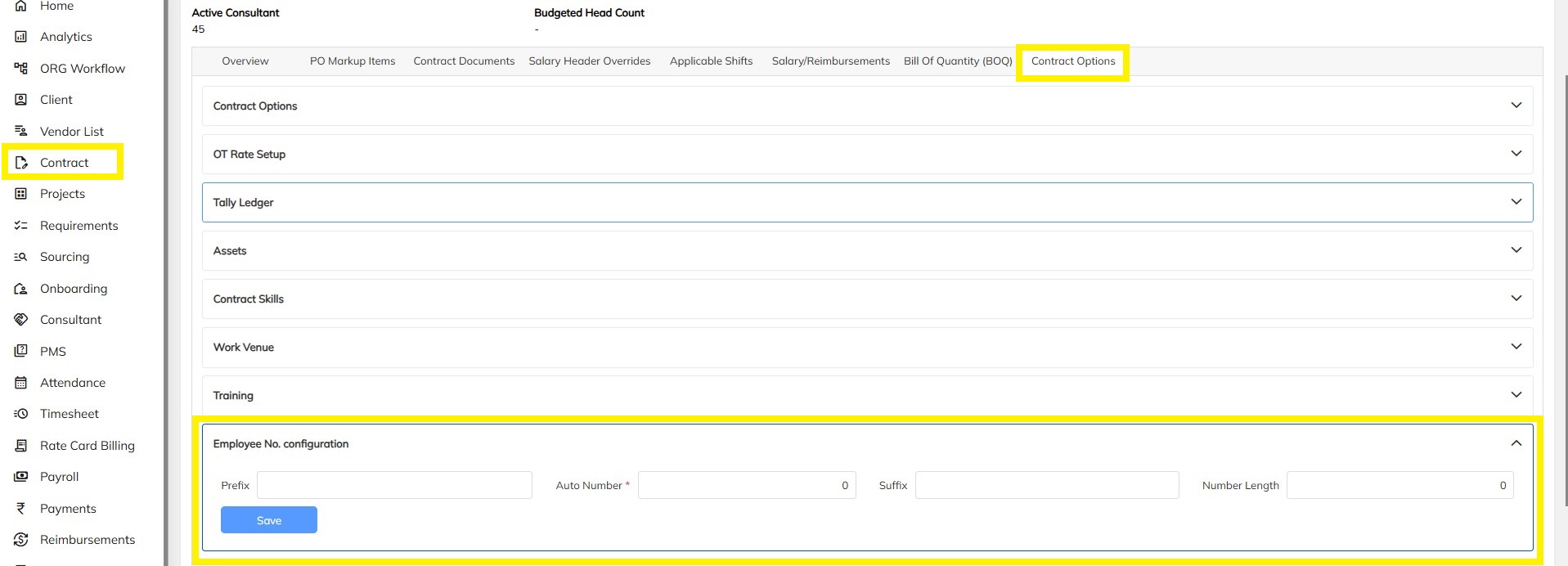 - Select client contract under contract module and choose the Contract options --> Click on Employee No. configuration section and Configure the Prefix, Auto Number, Suffix and Number length and Save