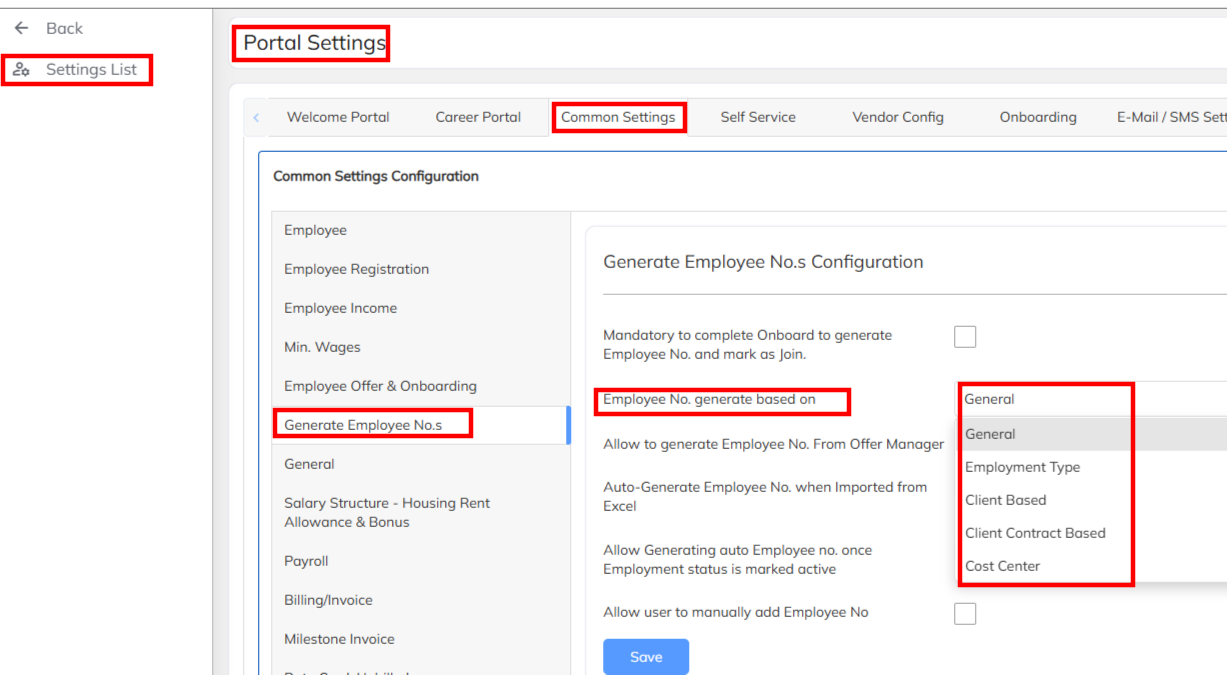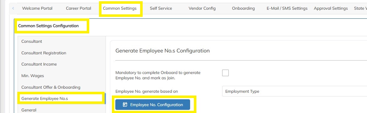- Click on Settings --->Company Set Up-->> Portal Settings-->> Choose the Common setting -->> Select the Generate Employee Nos-- >> Choose the Employee Nos generate based on option