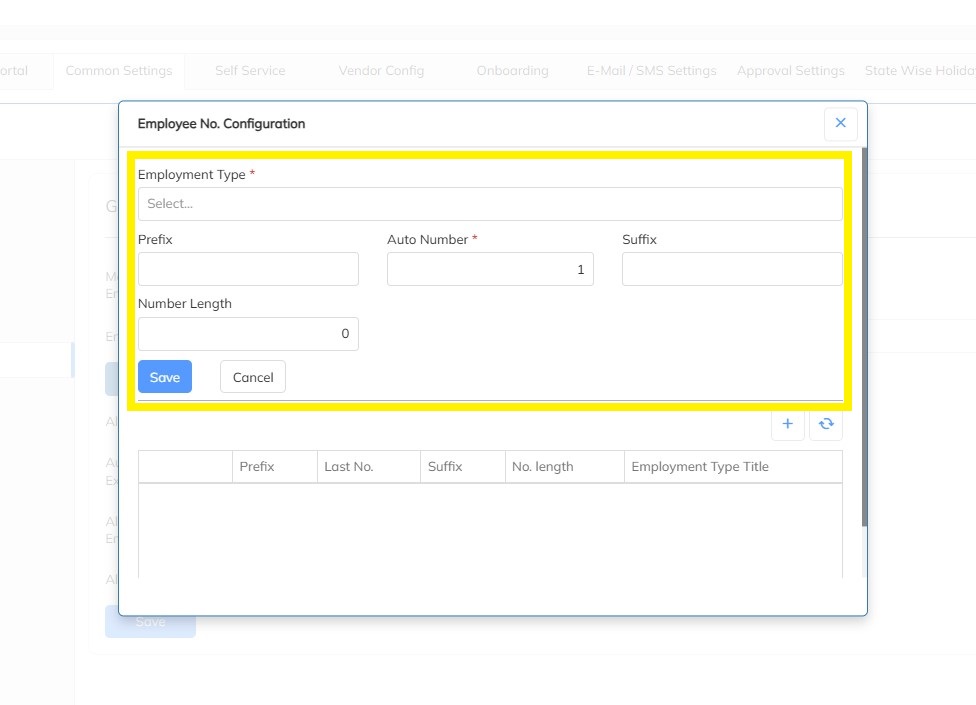 - Click on the Employee configuration Tab, Choose the employment type and Configure the Prefix, Auto Number, Suffix and Number length based on the various Employment Types created in the portal