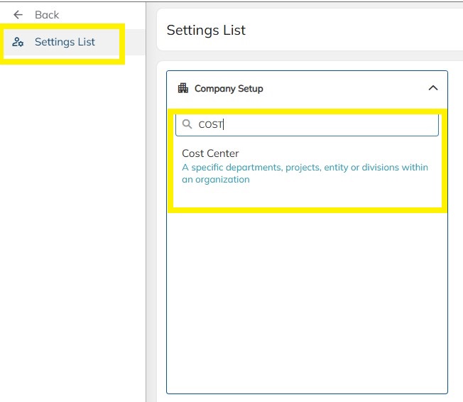 - Navigate to Settings --> Company Setup --> Select Cost center option