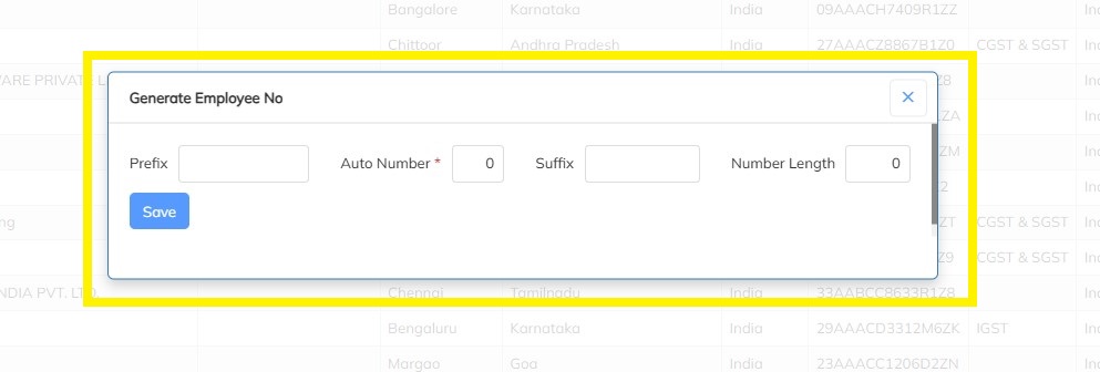 - Click on Icon below to Configure the Prefix, Auto Number, Suffix and Number length based on various Cost Centers and then Click on Save.