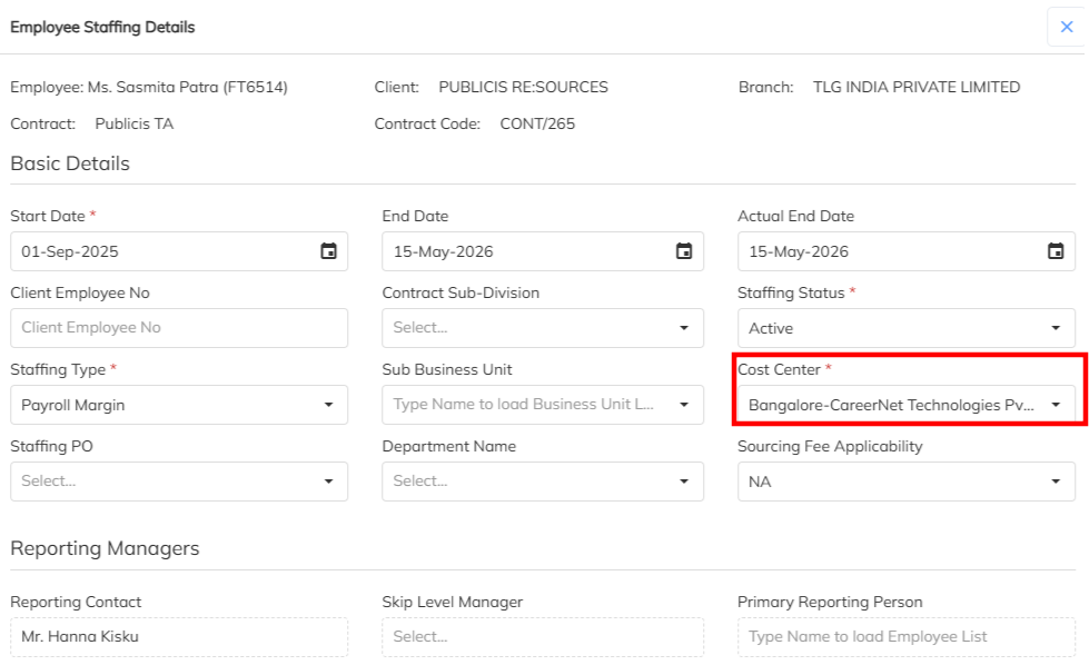 - Based on the employee mapped Cost center under Employee staffing details Employee code will generate. Before Employee code generate Mandatory to map the Cost center.