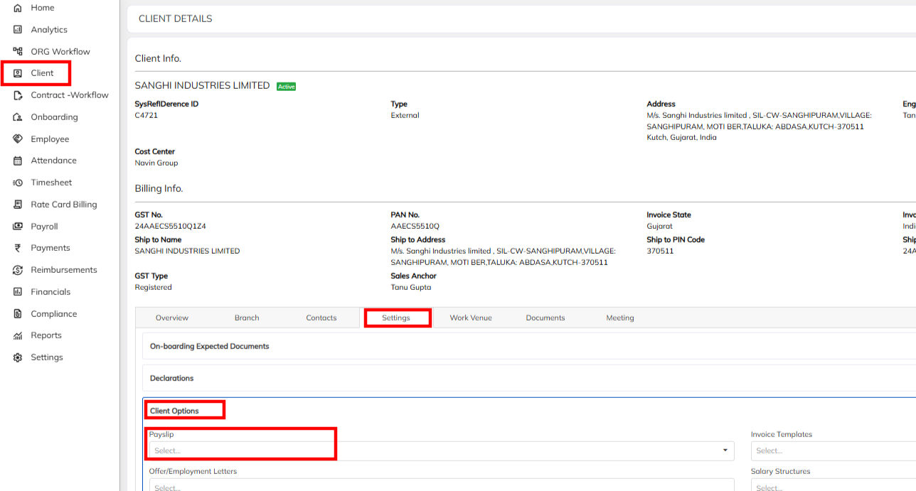 - Select the Setting option >> navigate to Client Option >>Map the client specified Payslip and save.