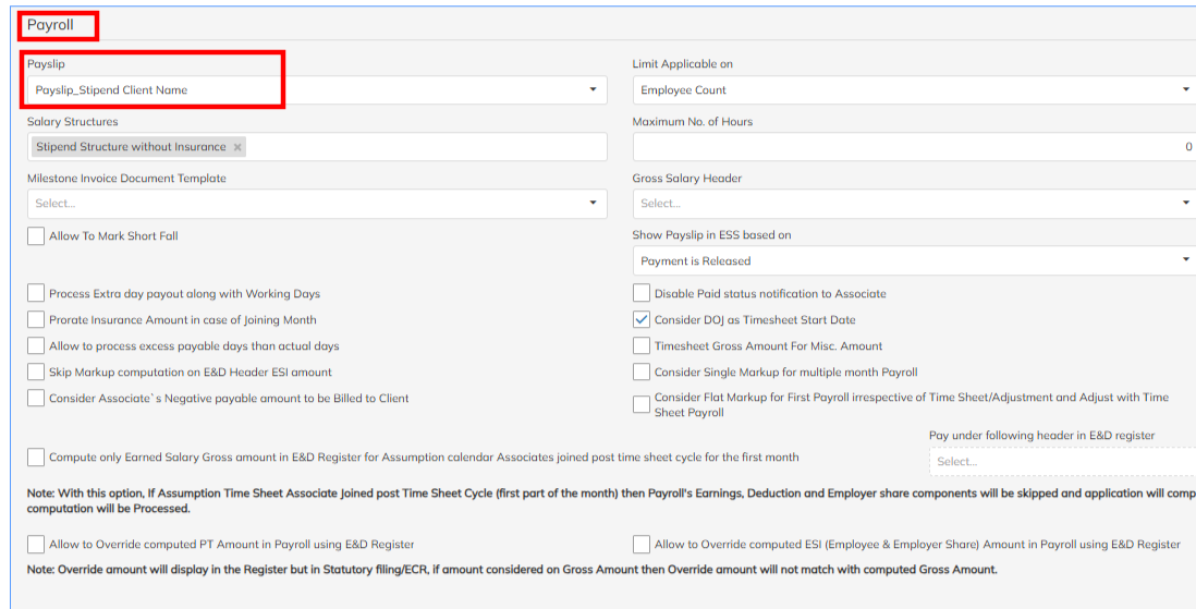 - Select the Contract option >> navigate to Contract Option >>Map the client specified Payslip under Payroll section and save.