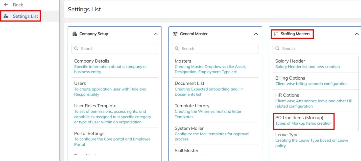 - Create the Sourcing mark up under Master level - Navigate to settings >>Staffing Master >> PO line items>> Create the Sourcing mark up details.
