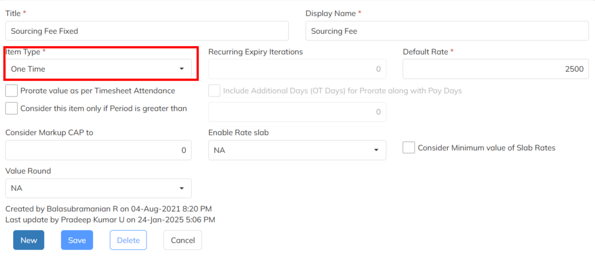 - Create the sourcing fees configuration with Item Type should be One time configuration. Add the client requirement mark up rate under Default Rate.