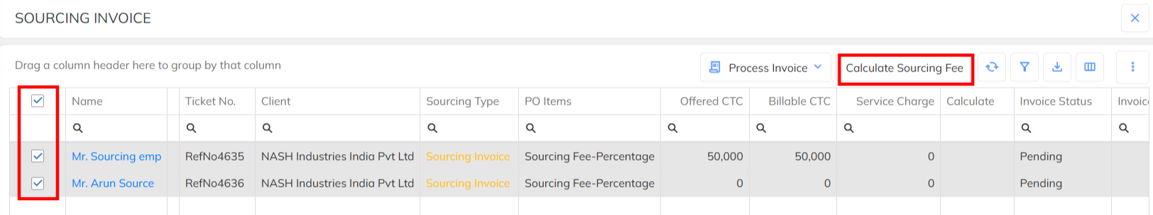 - Select the employees which need to raise sourcing invoice and use the calculate Sourcing fee option to compute Sourcing mark up bill amount based on the Fixed/ Percentage amount.