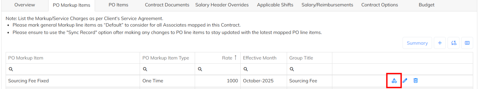 - Navigate to the Contract Module >> Select the specific client contract >> Choose the PO Markup item option to set up the sourcing mark up configuration .