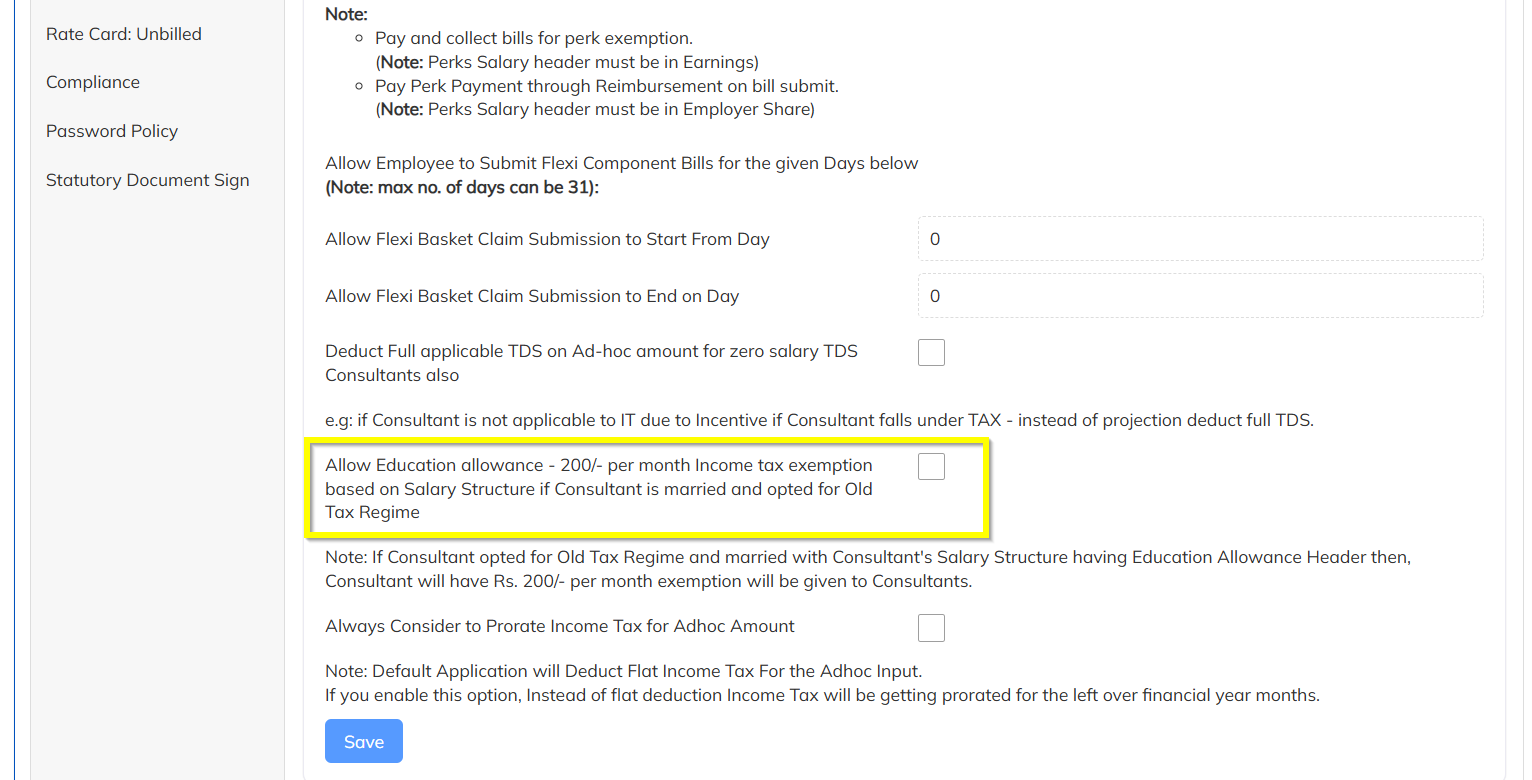 Introduced configuration to permit Education Allowance (₹200/month) exemption for employees under the Old Tax Regime with eligible salary structure headers.