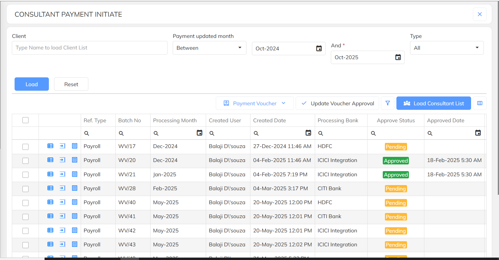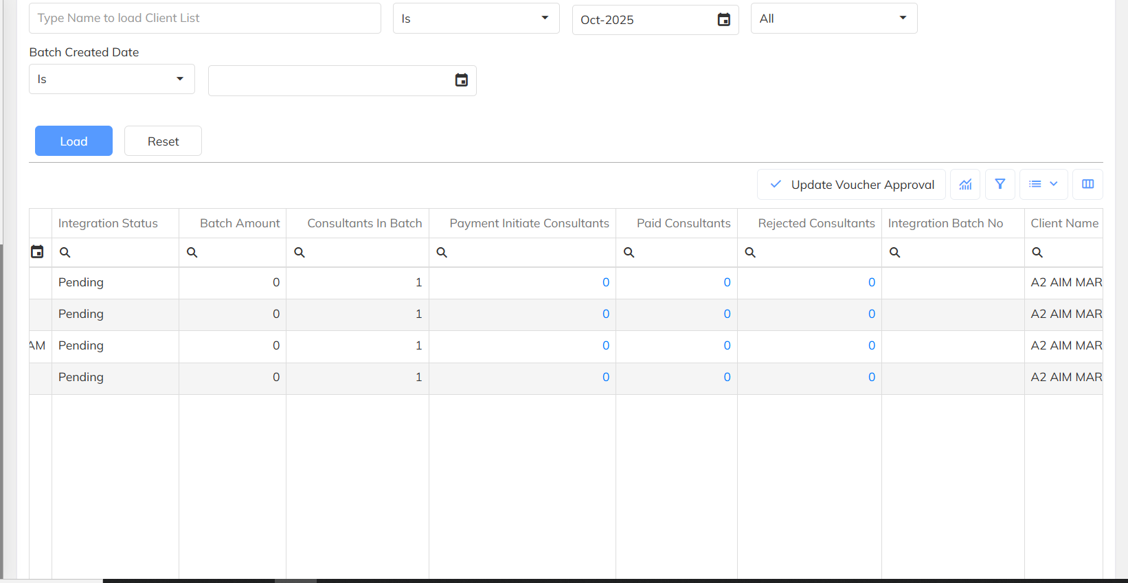 Added columns: Client Name, Internal Batch No., and Status in Payment Batch Details Page.