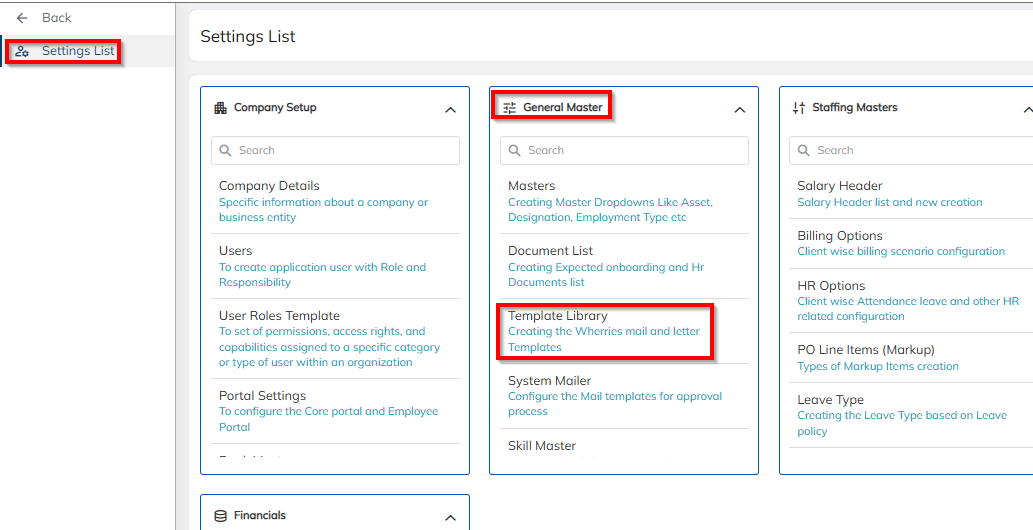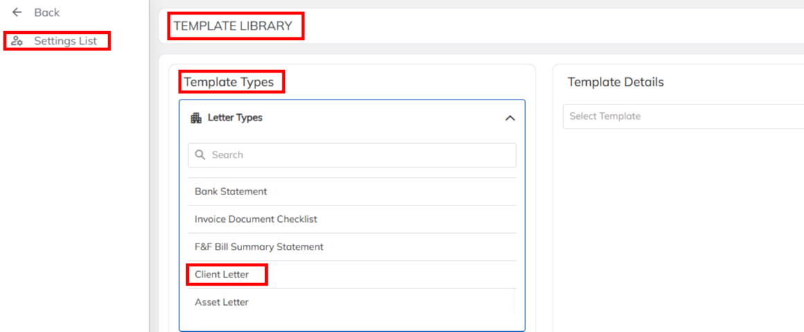 Navigate to >>Setting >> General master >> Templated library >> Chose the Template type/Letter type drop down as Client Letter which needs to configure in the application.