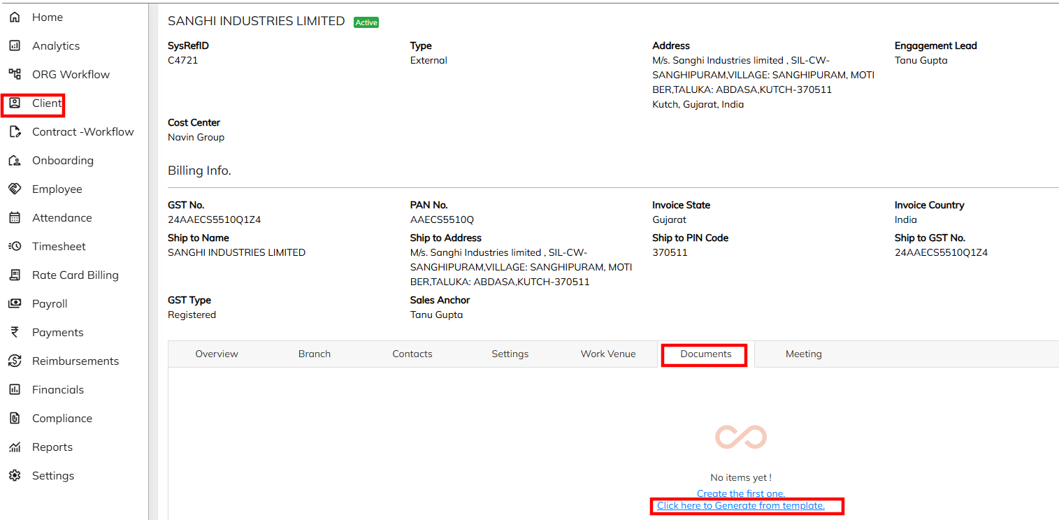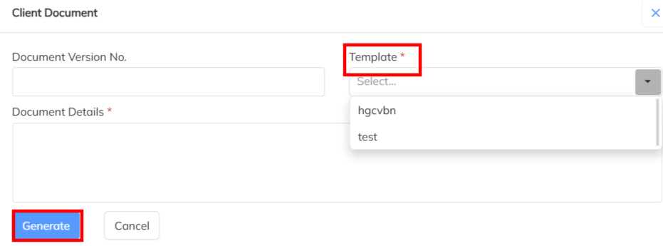 - Navigate to Client Module >> Select the specified Client and Navigate to Documents option and Click on Generate Letter option