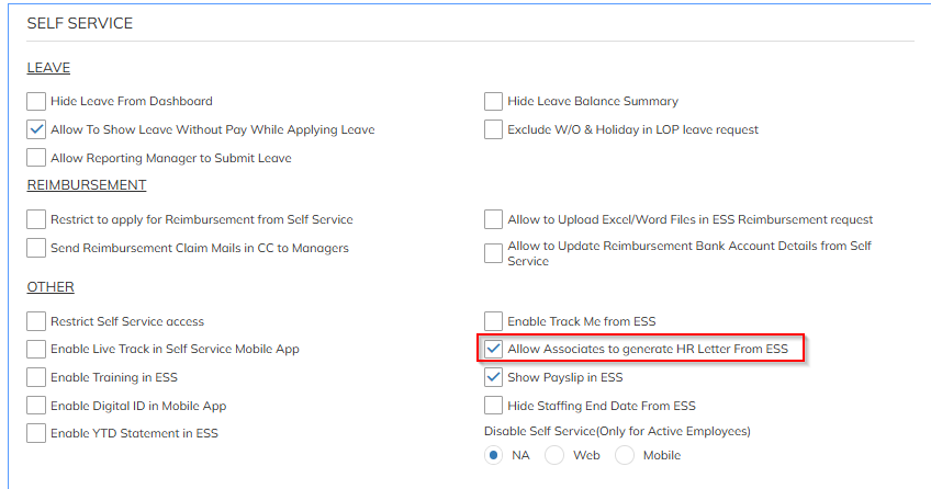 From the main menu, navigate to Settings → General Master → Template Library → under Letter Type select HR Reference Letter → Configure letter → Enable with Allow Associates to generate directly for self service(ESS) to do letter generation from ESS portal(WEB+MOBILE Application) as shown in below snapshot
