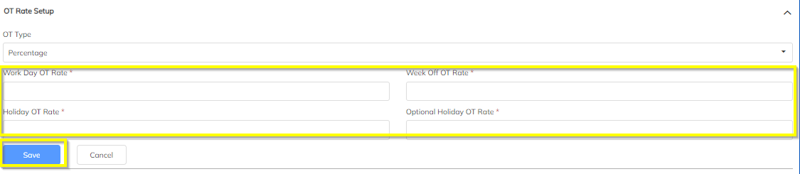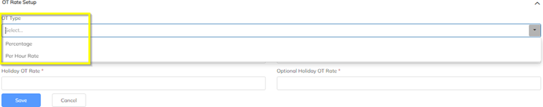 - Select the OT Type showing in the dropdown in terms of Percentage/ Hourly Rate.